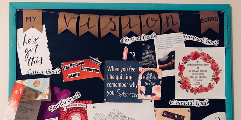 There are plenty of coaches who advocate using a vision board for our goals. This is because it makes our goals super visual and keeps us present to them throughout the week. If a vision board is too grandiose, have a pile of post-its that you can jot your goals on and stick them inside your cupboard. Then, every time you meet a goal, rip off the sticky square and toss it away in the bin.